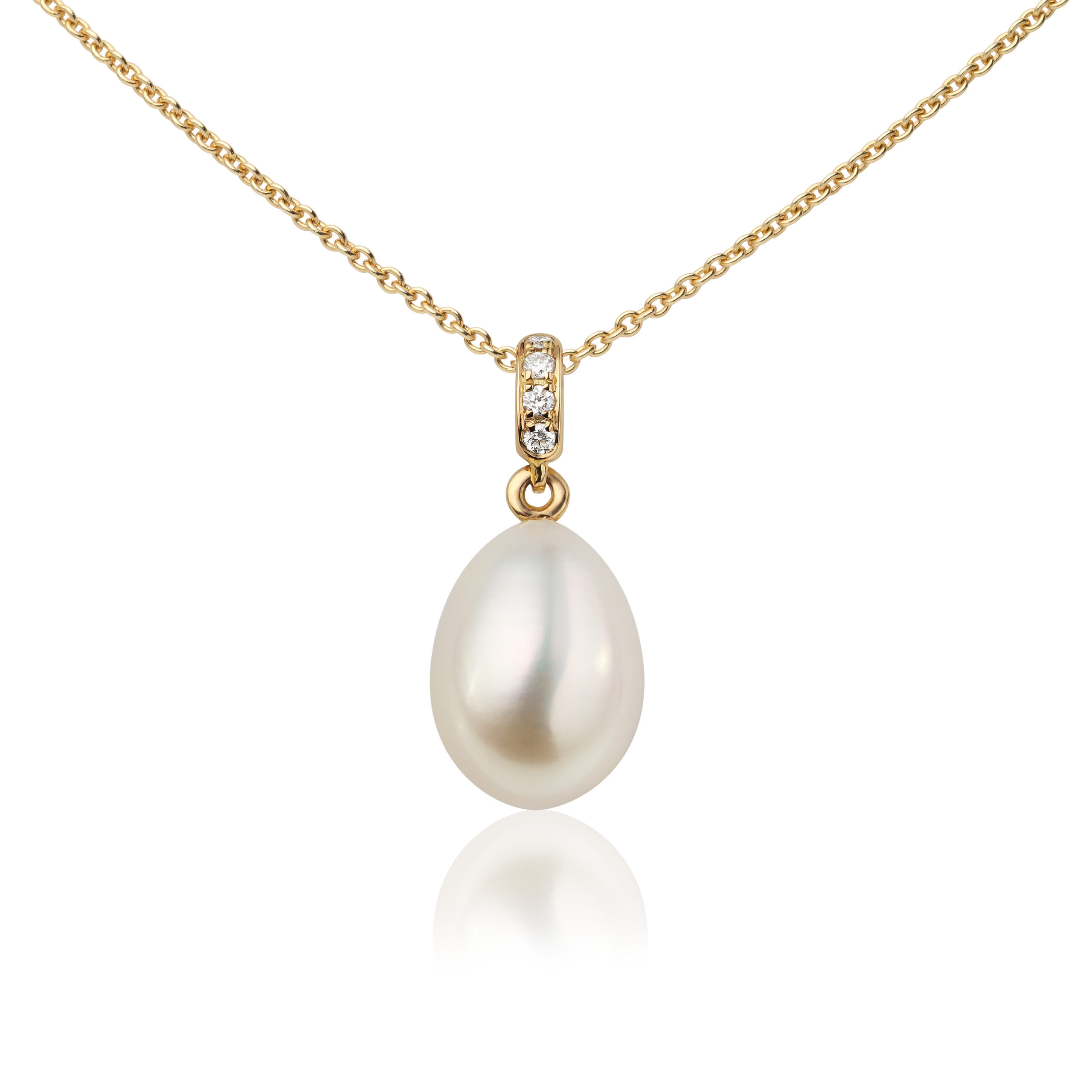 “Classy” pendant in 18k (750) yellow gold with a drop white 9.5mm – 10.0mm freshwater pearl and four diamonds 0.05ct. W/Si.