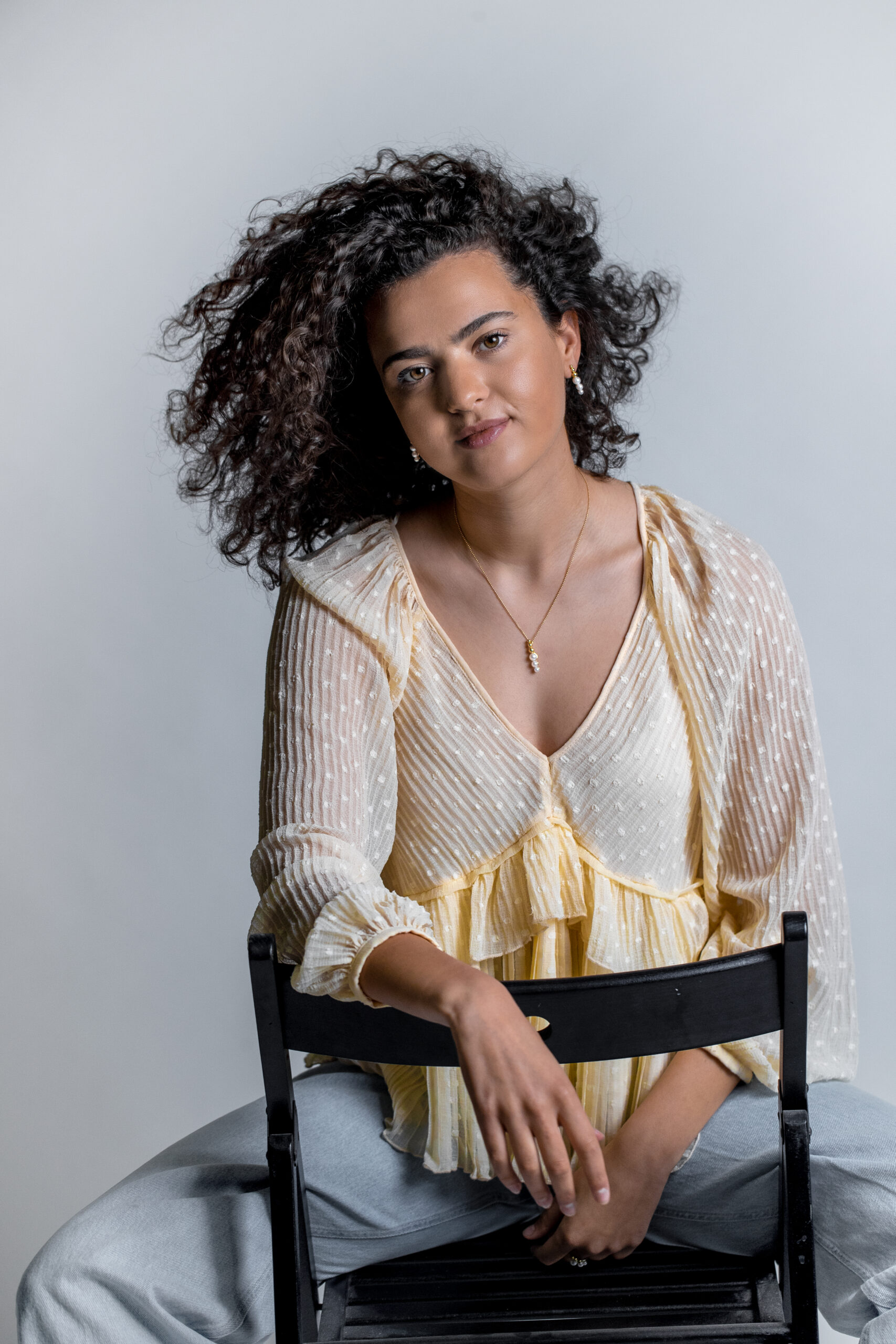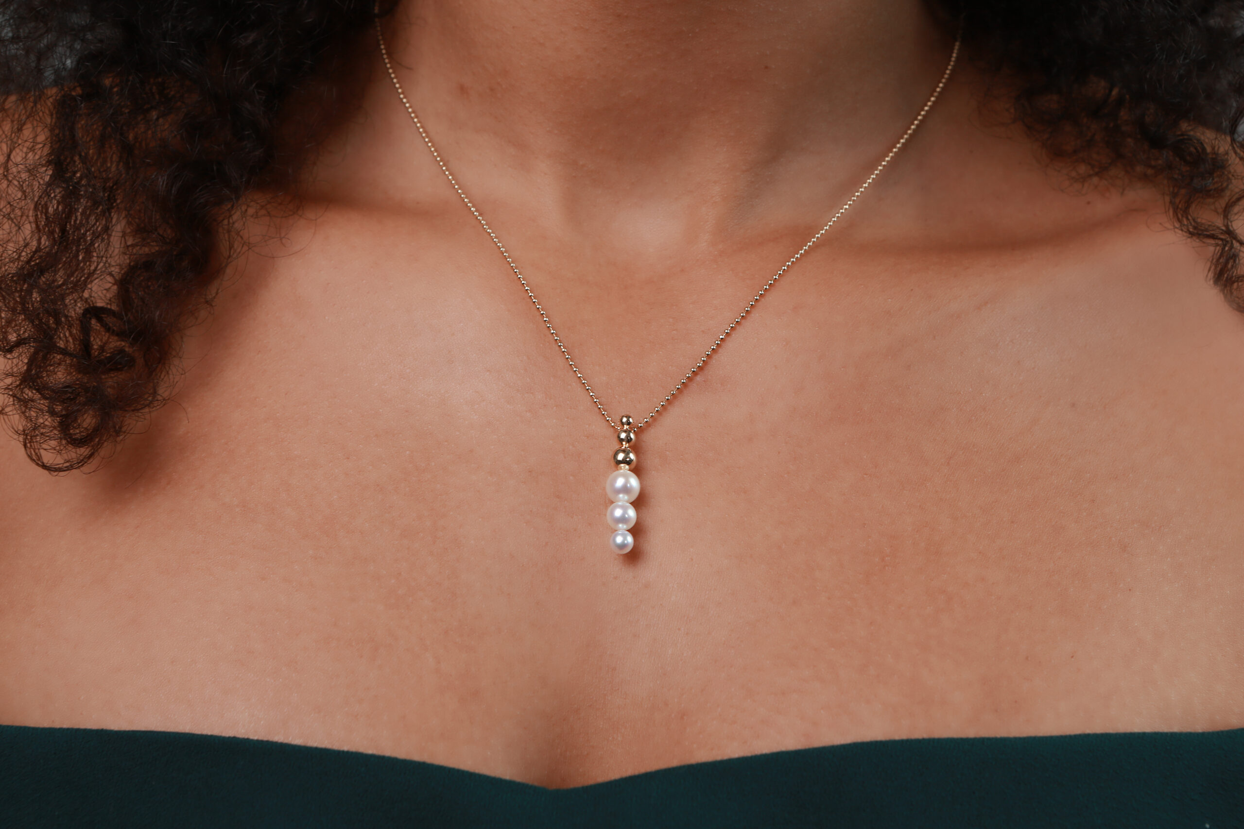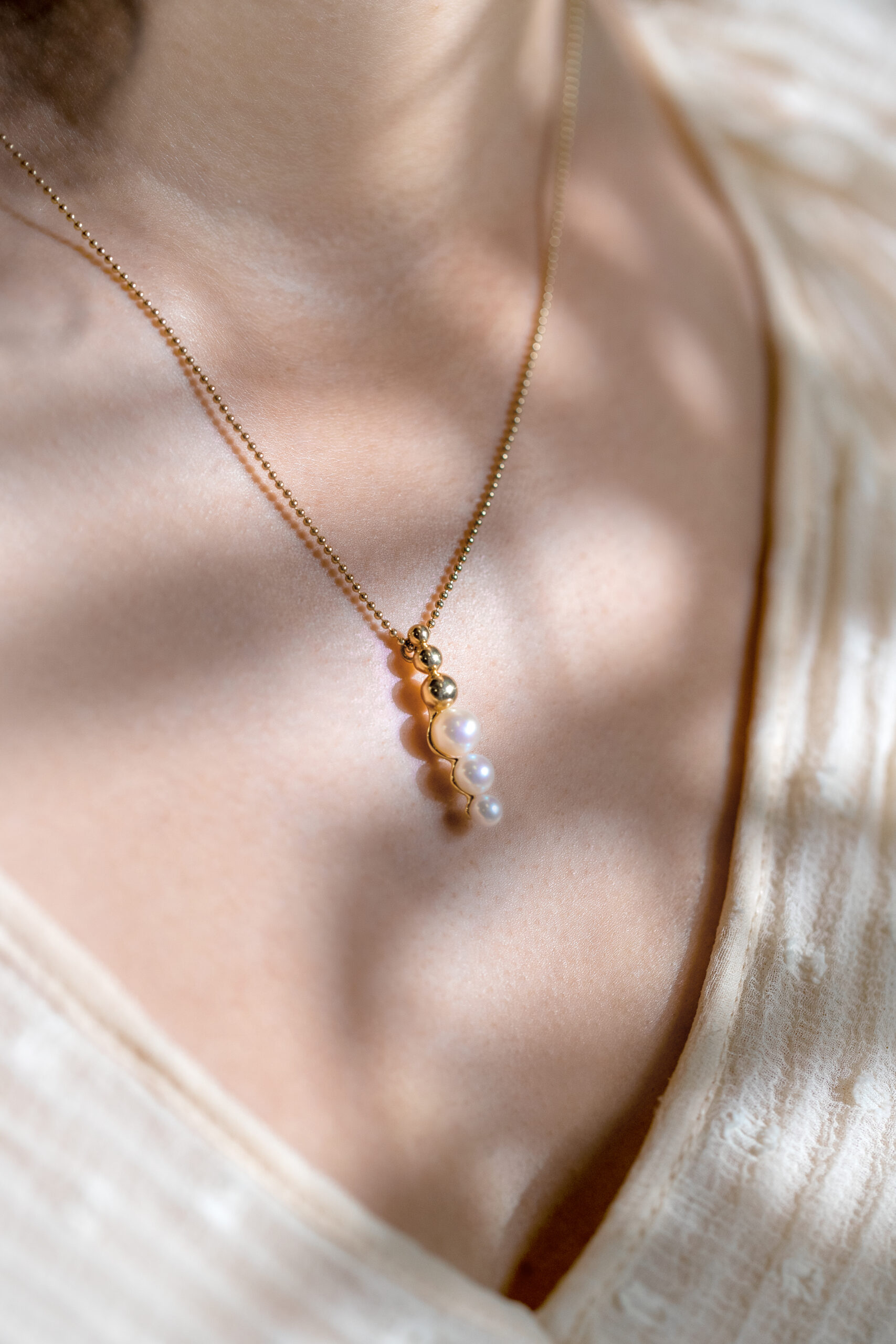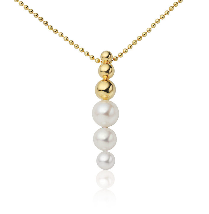 “Lebensfreude” collier in 14k (585) yellow gold with three different sized round white freshwater pearls. One with diameter 4,0mm – 4,5mm, one with 5,0mm – 5,5mm and one with 6,0mm – 6,5mm.
