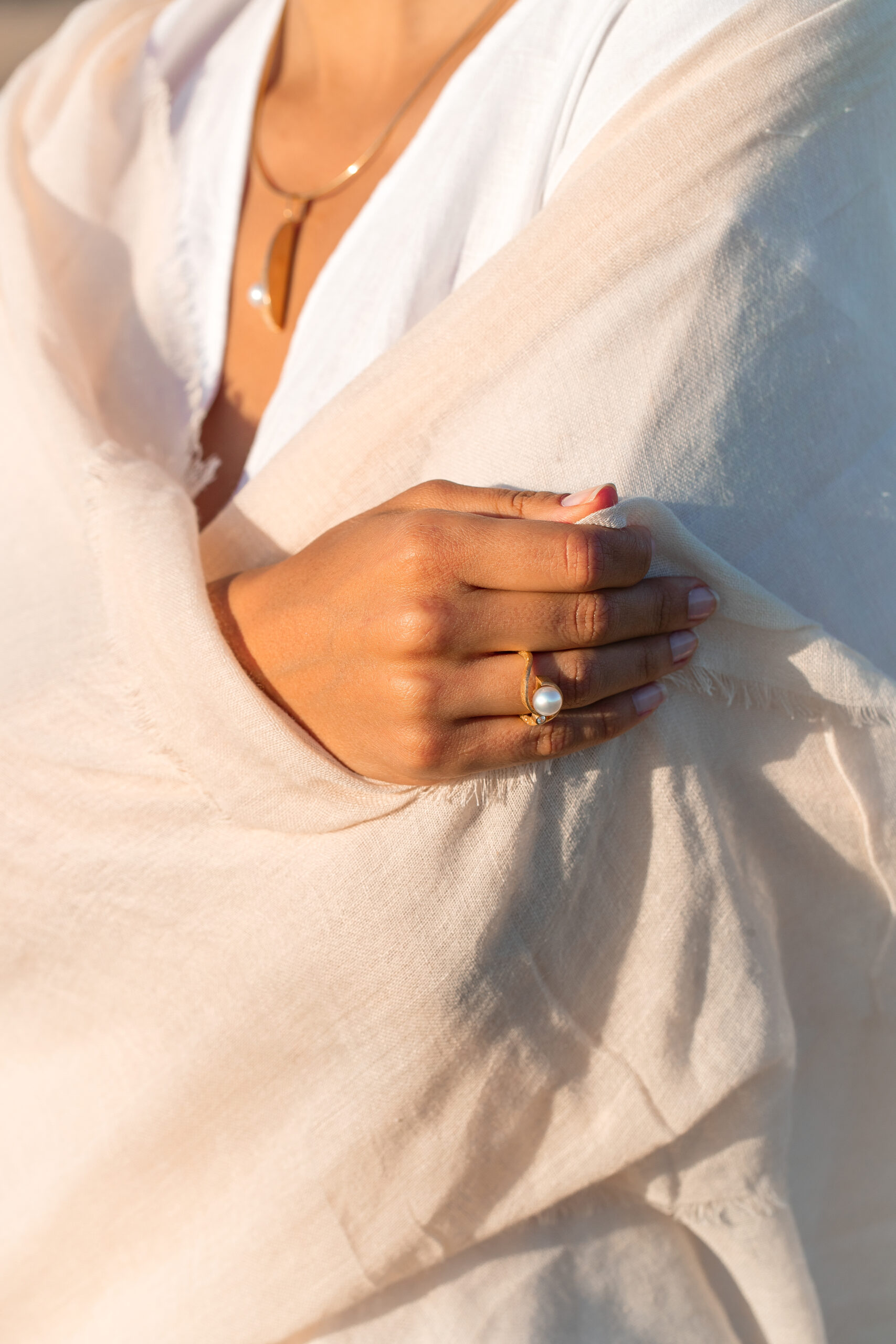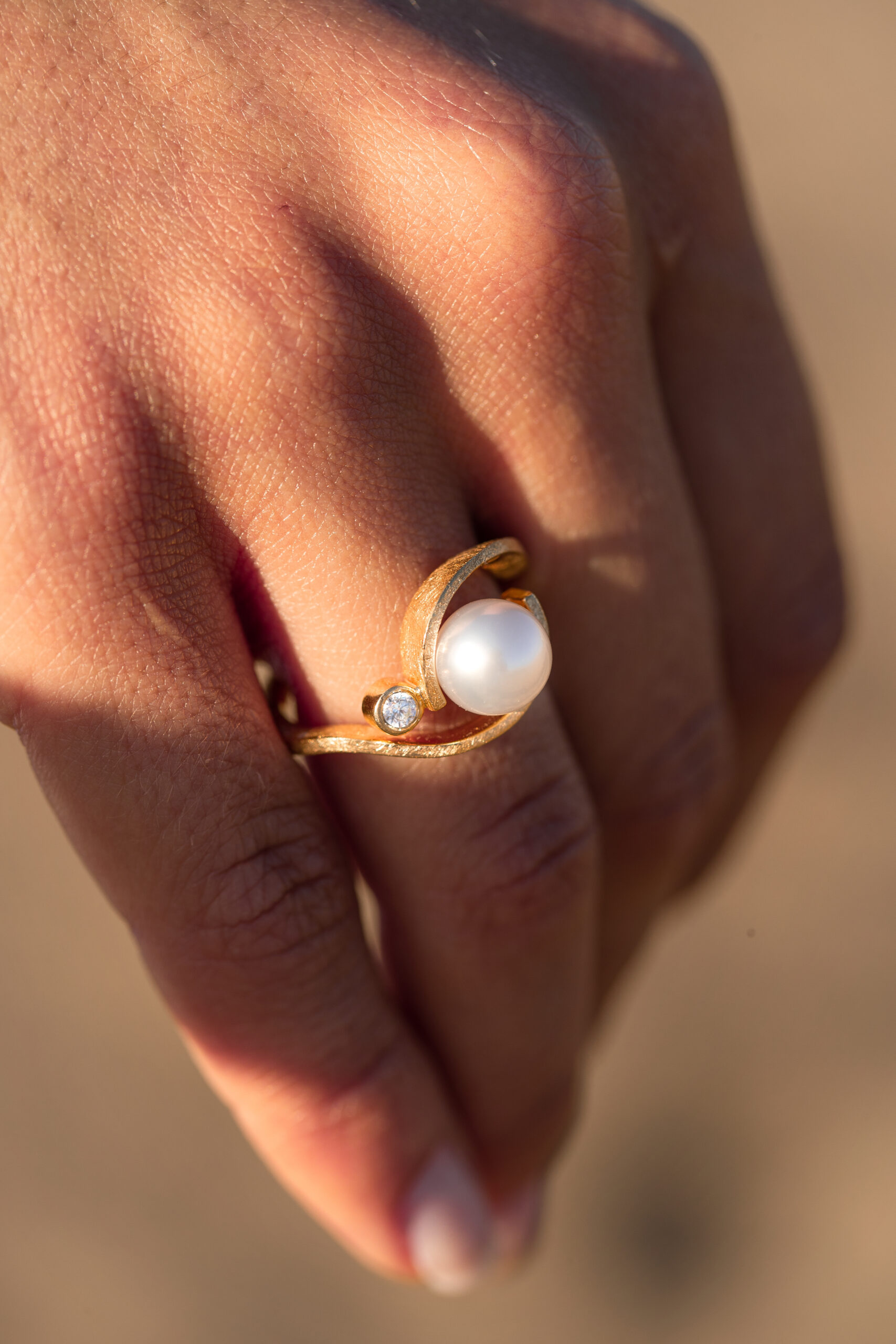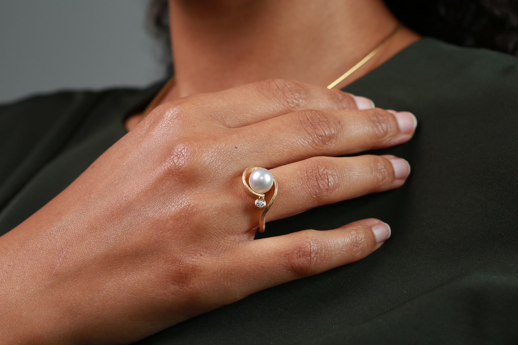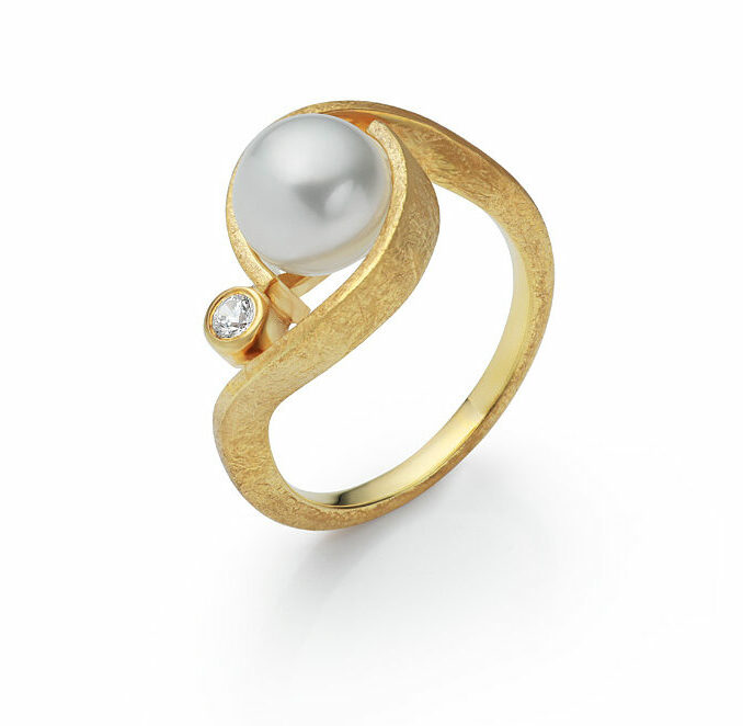 The elegantly curved “Lebenskraft” ring is a special eye-catcher for any occasion. Its harmonious shape is a reference to the moving surface of the sea and artfully embraces the precious South Sea pearl.