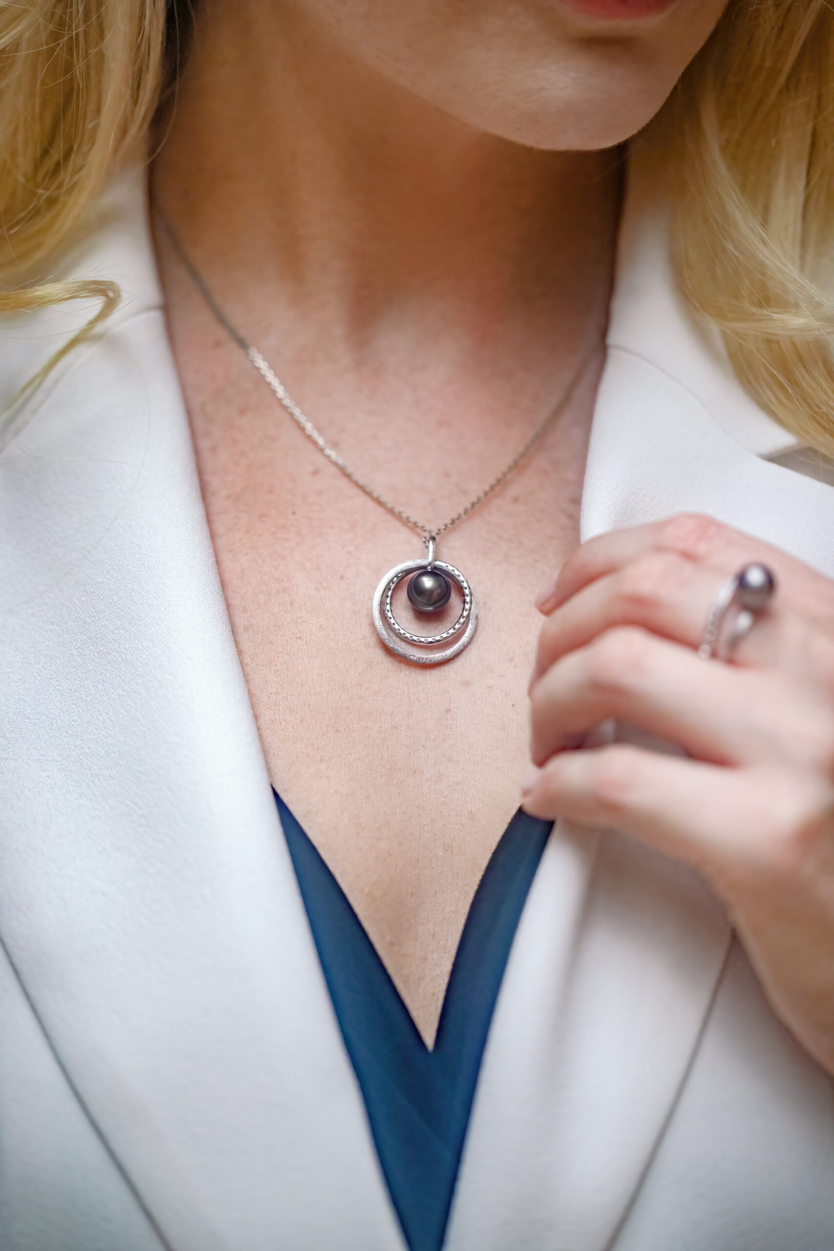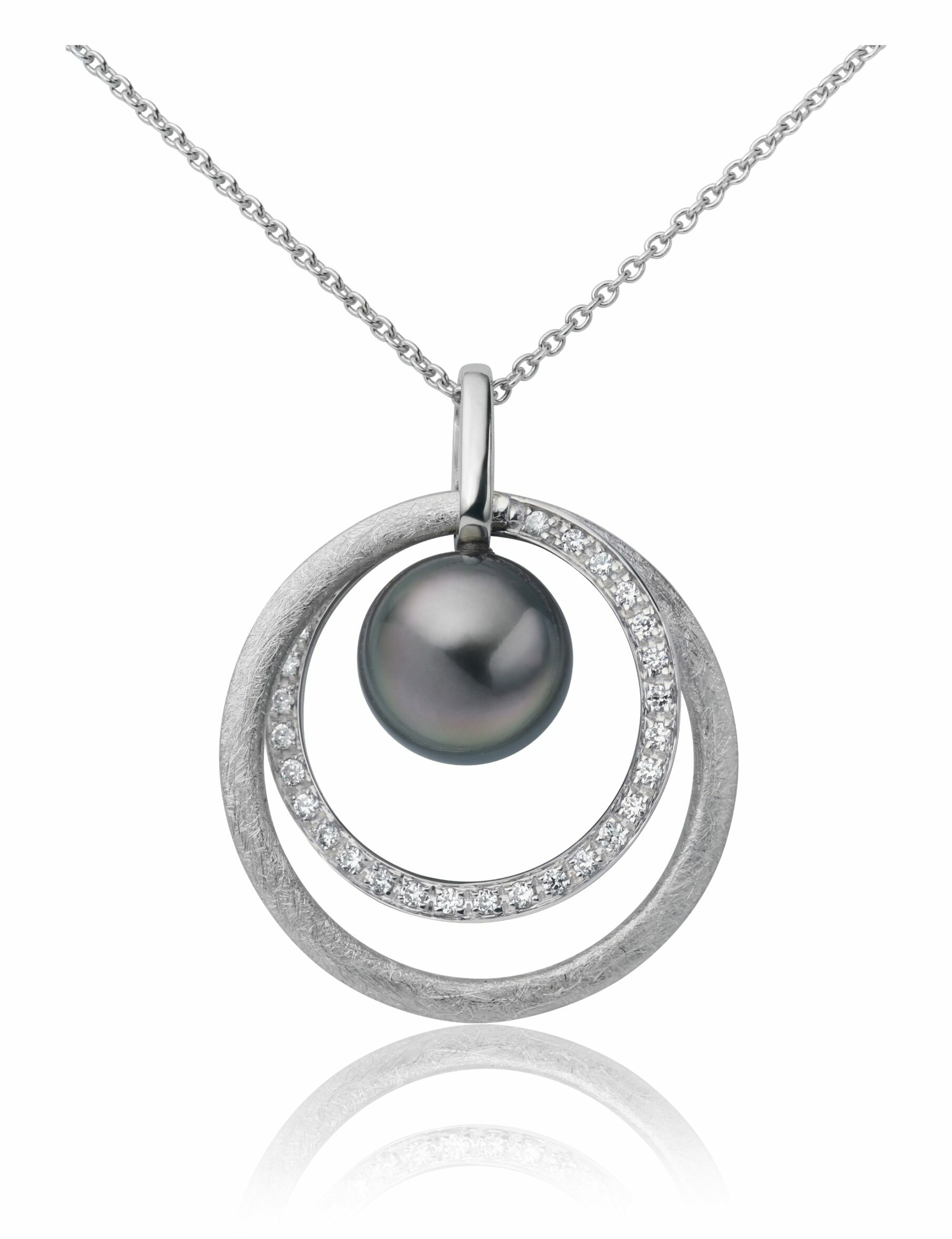 “Spirit Pearl” pendant in 14k (585) white gold with a round 9.0mm – 9.5mm Tahitian pearl and thirty 0.23ct. diamonds. W/Si.