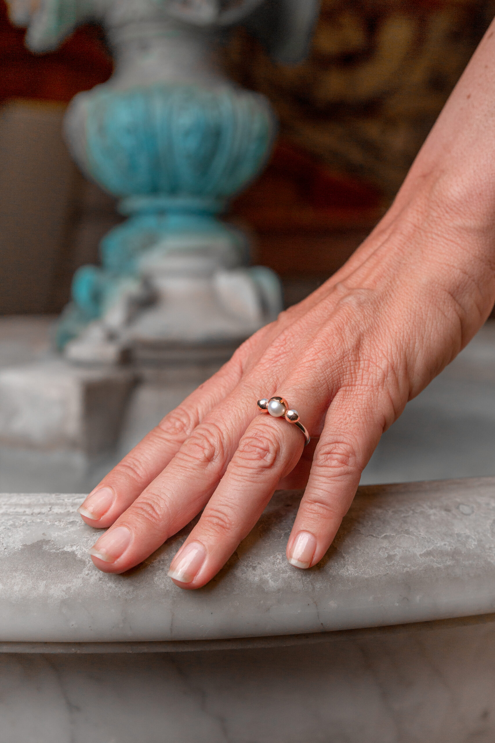 “Trinitas” ring two-tone in 14k (585) white gold and rose gold with three different size round white freshwater pearls. Two with diameter 4.0mm – 4.5mm and one with 6.0mm – 6.5mm.