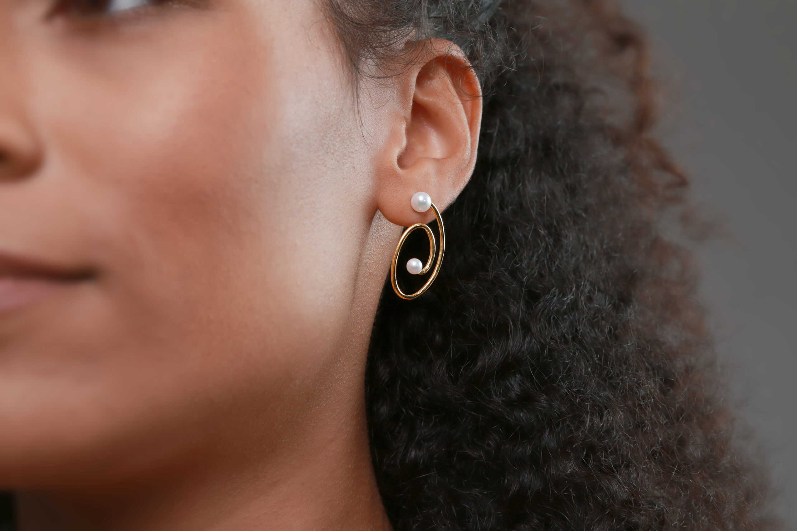 A well-rounded creation, the “Wasserspiel” earrings. With its special design of curved lines, this piece of jewelry showcases precious freshwater cultured pearls. In a minimalist modern way, they draw all eyes to themselves and thus put the handpicked freshwater pearls in the focus of attention.