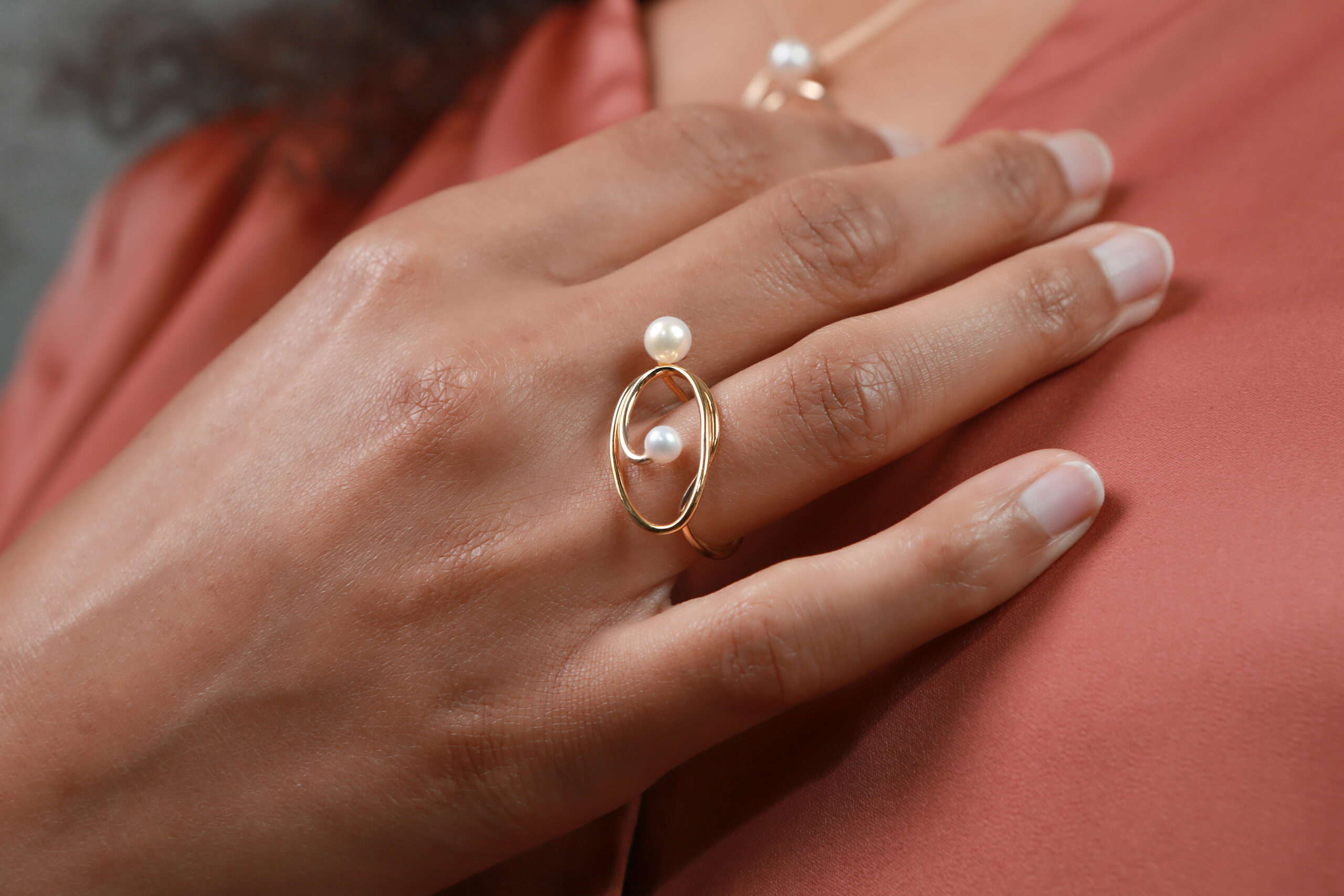 A well-rounded creation, the “Wasserspiel” ring. With its special design of curved lines, this piece of jewelry showcases precious freshwater cultured pearls. In a minimalist modern way, they draw all eyes to themselves and thus put the handpicked freshwater pearls in the focus of attention.