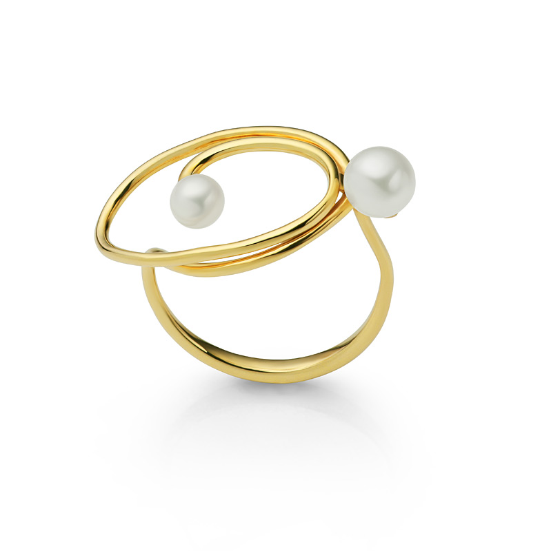 “Wasserspiel” ring in 14k (585) yellow gold with two different size round white freshwater pearls. One with diameter 4.0mm – 4.5mm and one with 5.0mm – 5.5mm.